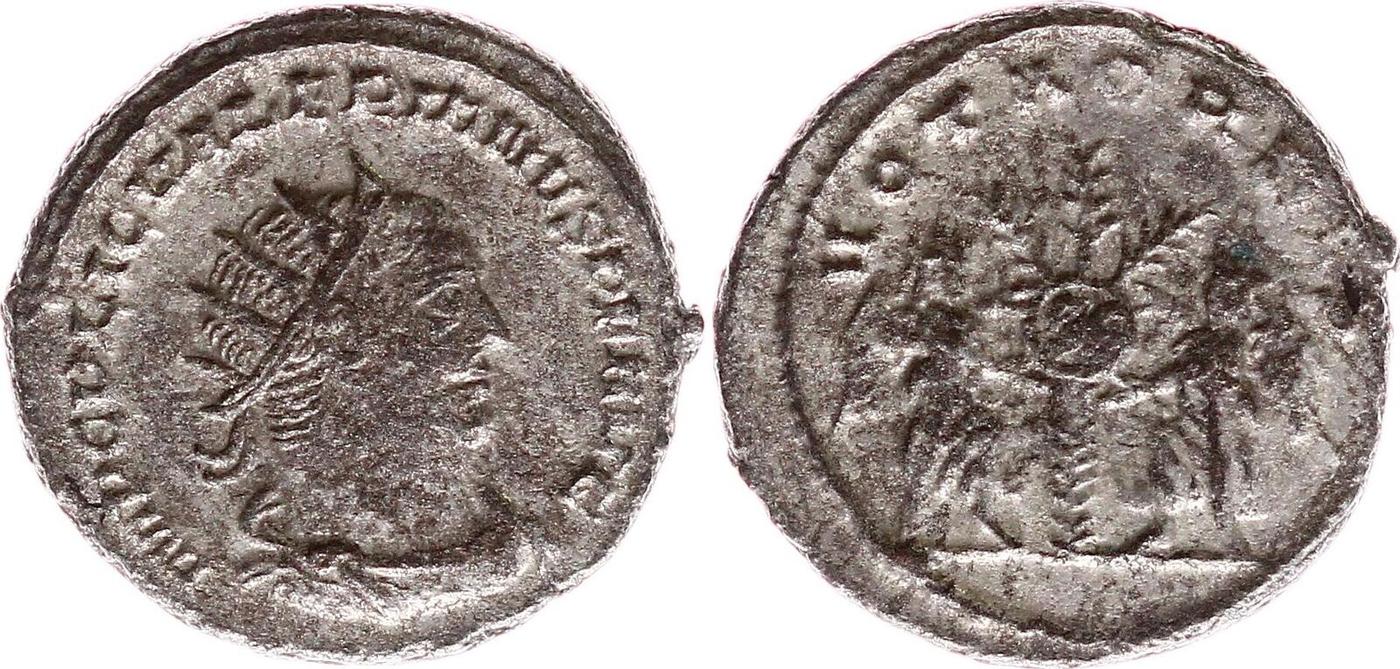 Im Sommer 260 wurde in der Schlacht von Edessa das Heer des römischen Kaisers Valerianus I. von den Sasaniden vernichtet und Valerianus selbst geriet in persische Gefangenschaft. Sein Sohn und Mitkaiser Gallienus musste sich in der Folge Einfällen von Germanen, Persern und Goten an mehreren Fronten sowie diversen Usurpationen stellen. In diesem Zuge entstanden auch zwei ‘Reichsabspaltungen’ - das Palmyrenische Reich (260-272) sowie das Gallische Sonderreich (260-274). Postumus, praeses provinciae Germaniae Inferioris, erhob sich im Herbst 260 gegen den Caesar Saloninus und ließ sich zum Augustus proklamieren. Postumus versuchte nicht seine Herrschaft auf das restliche Imperium Romanum auszuweiten, sondern begnügte sich mit Britannia, Hispania, Gallia und den germanischen Provinzen und kümmerte sich erfolgreich um die Abwehr der Germanen. Auch Gallienus widmete sich, abgesehen von einem Versuch im Jahre 265, die abgefallenen Provinzen wieder einzugliedern, einstweilen lieber der Befriedung der verbliebenen römischen Grenzen. Im Frühjahr 269 wurde Postumus nach einem zwar niedergeschlagenen Usurpationsversuch des Laelianus von seinen eigenen Soldaten ermordet - der Beginn der Destabilisierung des Imperium Galliarum. Marcus Aurelius Marius, angeblich erst Lagerschmied und dann Offizier, wurde vermutlich im Mai/Juni 269 zum Augustus erhoben. Laut dem spätantiken Geschichtsschreiber Aurelius Victor und der Historia Augusta soll Marius schon nach wenigen Tagen ermordet worden sein, die doch recht zahlreichen Münzen, die in Köln wie in Trier geprägt wurden, sprechen gegen eine solche Behauptung und lassen seinen Tod im Herbst des gleichen Jahres vermuten. Ihm folgten erst Victorinus, dann Tetricus I. und sein Sohn Tetricus II., bis Kaiser Aurelianus, der nach dem Tod des Gallienus die Herrschaft über das Imperium Romanum erlangt hatte, nach erfolgreicher Befriedung des Ostens im Frühjahr 274 Gallien zurückeroberte. Münzen des Marius sind auf Grund seiner recht kurzen Regierungszeit nicht sehr häufig, dennoch wurden mehrere Aureus- und Antoninian-Typen in zwei Münzstätten geprägt. Der Avers dieses Antoninians zeigt Marius mit Strahlenkrone und Panzer, während die Rückseite mit der Legende CONCORDIA MILITVM und den Händen im Handschlag sich auf die (für den Kaiser lebensnotwendige) Eintracht zwischen Kaiser und Armee bezieht. | Im Sommer 260 wurde in der Schlacht von Edessa das Heer des römischen Kaisers Valerianus I. von den Sasaniden vernichtet und Valerianus selbst geriet in persische Gefangenschaft. Sein Sohn und Mitkaiser Gallienus musste sich in der Folge Einfällen von Germanen, Persern und Goten an mehreren Fronten sowie diversen Usurpationen stellen. In diesem Zuge entstanden auch zwei ‘Reichsabspaltungen’ - das Palmyrenische Reich (260-272) sowie das Gallische Sonderreich (260-274). Postumus, praeses provinciae Germaniae Inferioris, erhob sich im Herbst 260 gegen den Caesar Saloninus und ließ sich zum Augustus proklamieren. Postumus versuchte nicht seine Herrschaft auf das restliche Imperium Romanum auszuweiten, sondern begnügte sich mit Britannia, Hispania, Gallia und den germanischen Provinzen und kümmerte sich erfolgreich um die Abwehr der Germanen. Auch Gallienus widmete sich, abgesehen von einem Versuch im Jahre 265, die abgefallenen Provinzen wieder einzugliedern, einstweilen lieber der Befriedung der verbliebenen römischen Grenzen. Im Frühjahr 269 wurde Postumus nach einem zwar niedergeschlagenen Usurpationsversuch des Laelianus von seinen eigenen Soldaten ermordet - der Beginn der Destabilisierung des Imperium Galliarum. Marcus Aurelius Marius, angeblich erst Lagerschmied und dann Offizier, wurde vermutlich im Mai/Juni 269 zum Augustus erhoben. Laut dem spätantiken Geschichtsschreiber Aurelius Victor und der Historia Augusta soll Marius schon nach wenigen Tagen ermordet worden sein, die doch recht zahlreichen Münzen, die in Köln wie in Trier geprägt wurden, sprechen gegen eine solche Behauptung und lassen seinen Tod im Herbst des gleichen Jahres vermuten. Ihm folgten erst Victorinus, dann Tetricus I. und sein Sohn Tetricus II., bis Kaiser Aurelianus, der nach dem Tod des Gallienus die Herrschaft über das Imperium Romanum erlangt hatte, nach erfolgreicher Befriedung des Ostens im Frühjahr 274 Gallien zurückeroberte. Münzen des Marius sind auf Grund seiner recht kurzen Regierungszeit nicht sehr häufig, dennoch wurden mehrere Aureus- und Antoninian-Typen in zwei Münzstätten geprägt. Der Avers dieses Antoninians zeigt Marius mit Strahlenkrone und Panzer, während die Rückseite mit der Legende CONCORDIA MILITVM und den Händen im Handschlag sich auf die (für den Kaiser lebensnotwendige) Eintracht zwischen Kaiser und Armee bezieht. | ||