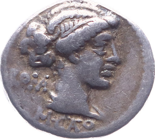 Der Denar wurde in Referenz auf die Siege Caesars während seines Prokonsulats in Gallien geprägt. 59 v. Chr. waren Caesar die Provinzen Illyricum und Gallia cisalpina für fünf Jahre zugesprochen worden, kurz darauf noch zusätzlich Gallia Nar-bonensis. Während seines Imperiums führte er seine Legionen gegen die Helvetier und Sueben unter Ariovist. Mit Feldzügen im heutigen Aquitanien und der Normandie konnte er weite Teile Galliens erobern. Nach der Verlängerung seiner Imperiums um fünf Jahre überquerte er erstmals den Rhein für eine kurze Strafexpedition gegen die Germanen und führte dann zwei Feldzüge nach Britannien. Der Gallische Aufstand unter Führung des Avernerfürsten Vercingetorix 52 v. Chr. beschloss nach einigen Anfangserfolgen mit dessen Niederlage in Folge der Belagerung von Alesia quasi den gallischen Widerstand. Schon 50 v. Chr. galt Gallien als befriedet. Der ‘De bello Gallico’ stellt heute die wichtigste Quelle für die Eroberung Galliens dar. Den Avers dieses schönen Denars ziert die Göttin Venus, die durch ihren Sohn Aeneas und dessen Sohn Ascanius/Iullus als Stammmutter der Iulier galt und die persönliche Schutzgottheit Caesars war. Der Revers zeigt ein Tropaion, also ein Kompositum aus den Waffen der gefallenen Feinde, die an einem Pfahl aufgehängt wurden und die als Denkmal der Flucht der Feinde und des Sieges die Gestalt eines Menschen/Soldaten nachahmten. Es trägt an jeder Seite den typischen gallischen ovalen Schild und ein keltisches Blasinstrument mit gebogenem Kopf, die carnyx, die bei Kriegszügen Verwendung fand. Der Helm mit den typischen Hörnern vervollständigt das Tropaion. Neben diesem sitzen zwei Gefangene, linkerhand eine weibliche, im Trauergestus den Kopf in ihre Hände gestützt, dem rechts sitzenden Mann sind die Hände hinter dem Rücken gebunden. Beide Gefangene symbolisieren ebenso wie die typischen Waffen den Sieg Caesars über Gallien, wobei der Gallier teilweise als Vercingetorix identifiziert wurde.