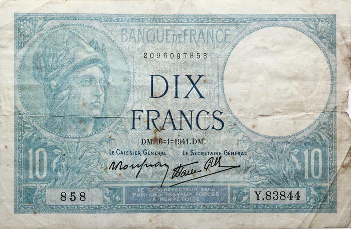 3. Seit August 1795 französische Silbermünze im Dezimalsystem, Feingewicht: 4,5 g Silber bei 5 g Rauhgewicht. Gepräge der ersten Münzen Vs. Herkules zwischen der Égalité und der Liberté (Personifikation der Gleichheit und der Freiheit), Rs. Wertangabe. Bei wechselndem Bild und Feingehalt wurden auch 1⁄4-, 1⁄2-, 2- und 5- F.-Stücke sowie aus Gold Stücke zu 100, 50, 40, 20, 10 und 5 F. geprägt. Die zeitweilig von der Union Latine (→ Lateinischer Münzbund ) geprägten 900⁄1000 feinen 5-Francs-Stücke wurden ab 1878 nicht mehr ausgebracht, da Frankreich auf → Bimetallismus beharrte und die Gold-, Silber- und Papiergeldwährungen der Unionsländer nicht in Einklang gebracht werden konnten. Der Franc blieb als Währungseinheit Frankreichs bis zur Einführung des Euro am 1. Januar 2002 bestehen, 1 F. = 100 Centimes.