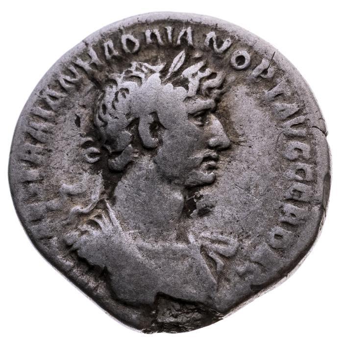 Denar des Kaisers Hadrianus (117 – 138) mit der Darstellung der Personifikation der Africa auf der Rückseite. Die lagernde Africa hält ein Füllhorn und mit der anderen Hand einen Skorpion, zu ihren Füßen steht ein Modius.