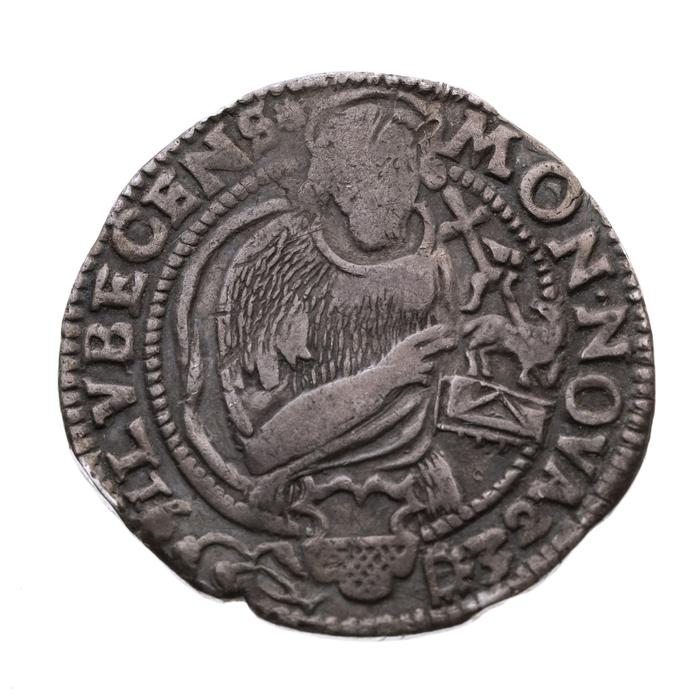 Sundischer Schilling (Sechsling nach lübischem Fuß) 1538 der Stadt Stralsund mit dem „redenden“ Wappen der Stadt, dem Strahl, auf der Vorderseite